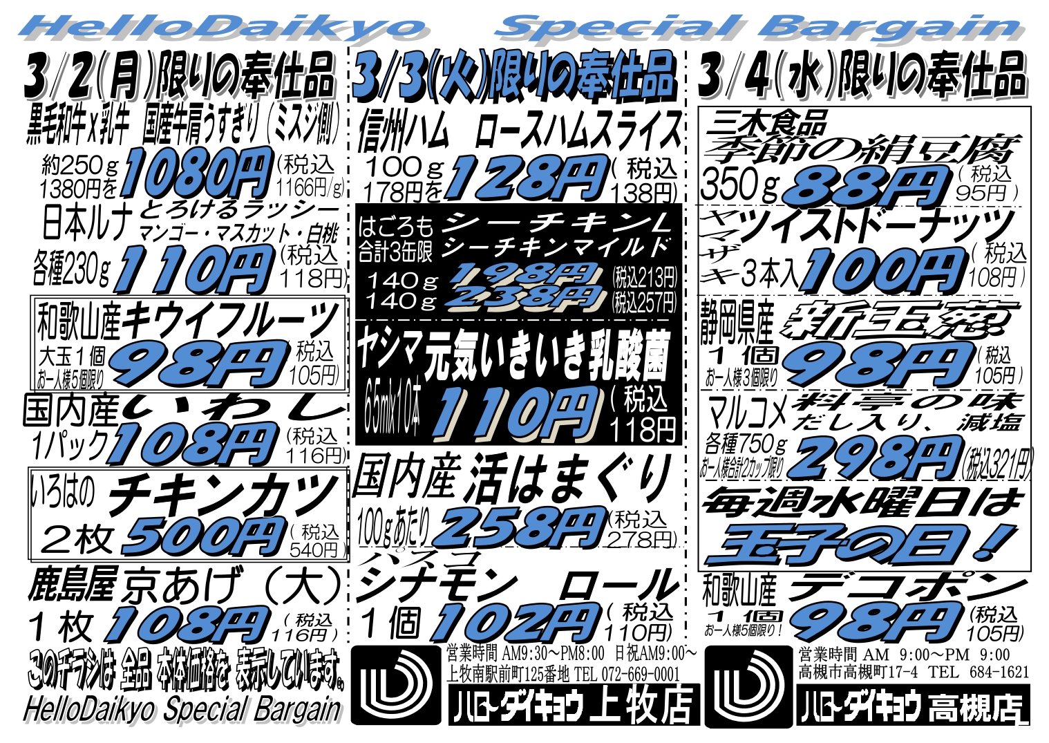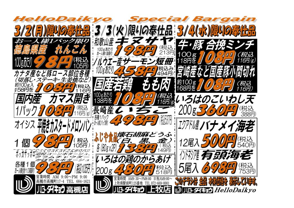 Categories 売り出し 1月15日(木)~18日(日)続く寒さに自慢の我が家鍋!!大売出し!! Post author By ryuzo Post date 2023年8月16日 Sticky post 詳しくはこちらをクリック♪ ← ハローダイキョウのインスタグラムはこちら! → 愛されて50年!! 炭焼き 祝鯛