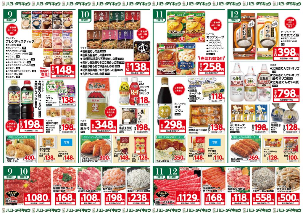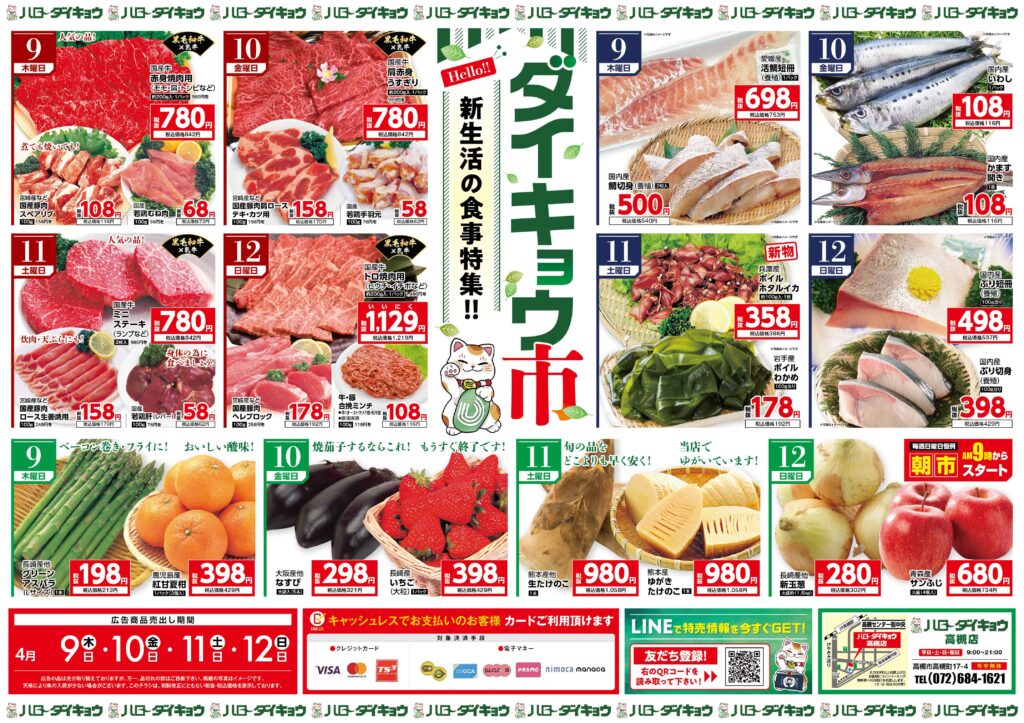 Categories イベント 毎週日曜日 朝市開催! Post author By ryuzo Post date 2025年3月2日 Sticky post 日曜朝市はダイキョウ元気市!! 明日からの元気と食卓を笑顔になっていただきたく、毎週日曜日、 朝9時~12時までの3時間限定で朝市ダイキョウ元気市を開催いたします! 新鮮なお魚を中心に各部門(精肉、野菜、日配)などから 普段では買えないお値段で販売いたします。 その日その時の新鮮な商品とお値段でお客様に元気を! これが当店の です! 毎週週替わりで来ていただいたお客様に喜んでいただける品揃えとお値段で お客様のお越しをお待ちしております。 日曜限定 朝9時~12時まで
