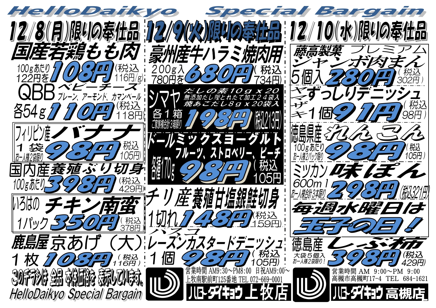 広告の品以外の大特価目白押し!!各担当バイヤーが皆様によろこんで頂ける品々を仕入れ準備して、お客様をお待ちしております!